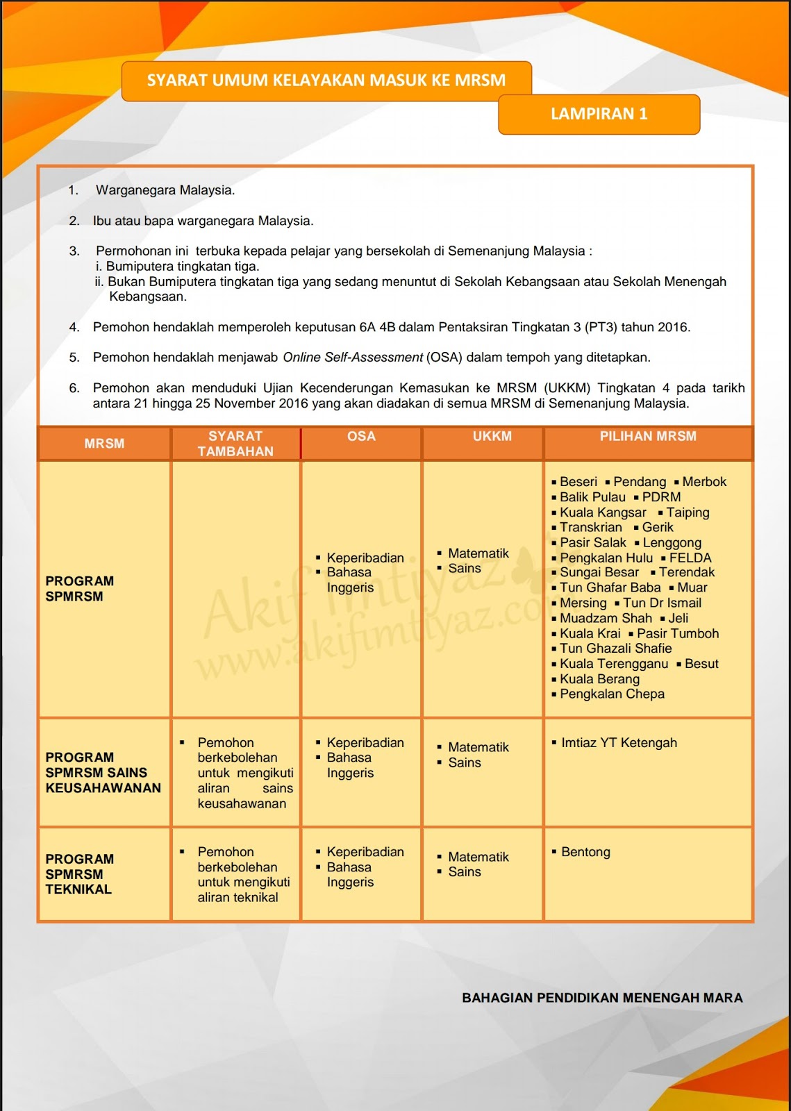 Semua pelajar tahun 6 (upsr) dan tingkatan 3 (pt3) yang berminat memasuki mrsm adalah dinasihatkan untuk merujuk lepada syarat kelayakan mrsm.