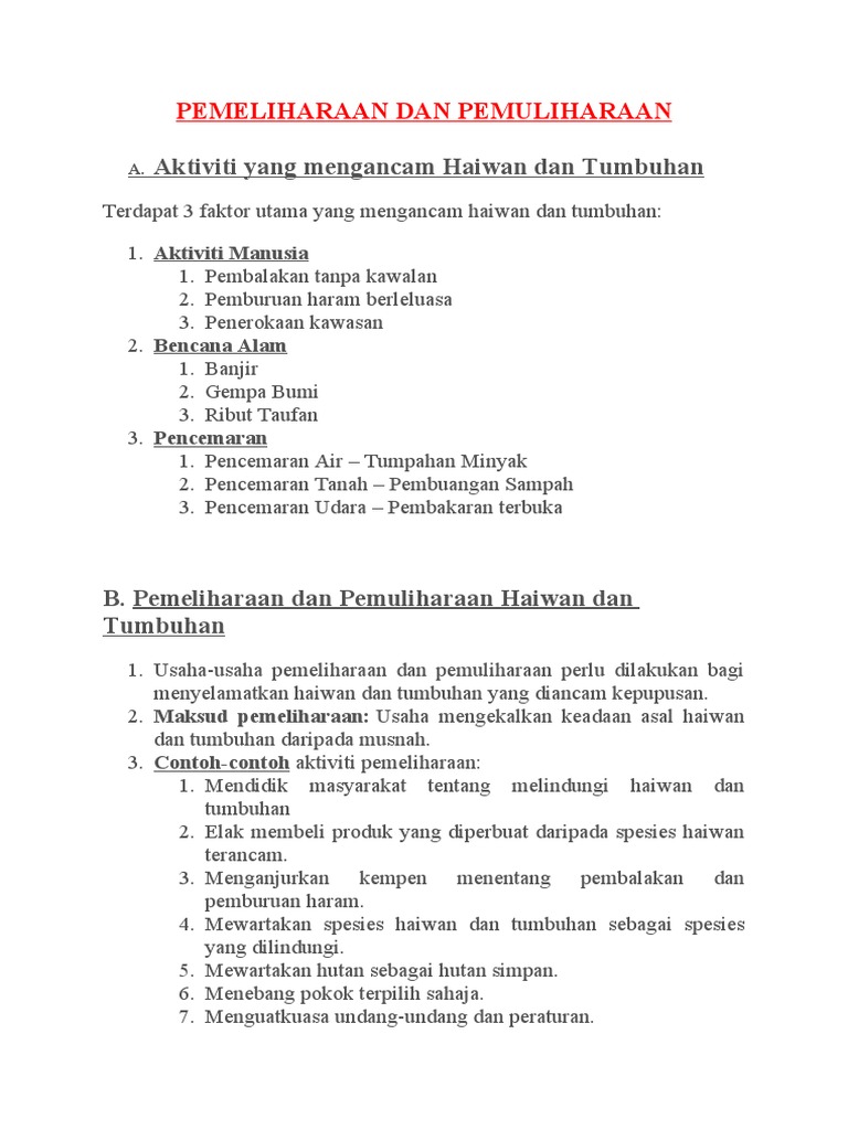 Maksud pemeliharaan dan pemuliharaan pemeliharaan : Mengekalkan keadaan asal haiwan dan tumbuhan daripada musnah. Dalam kitar air pula, air tersejat dari proses transpirasi tumbuhan dan. Savesave pemeliharaan dan pemuliharaan haiwan dan tumbuhan for later. Pemeliharaan 保育方法(抄在p.153) 1.penebangan terpilih 限制性砍伐 2.rawatan silvikultur人工培育 3.mewartakan 设立taman negara ,kawasan perlindungan hidupan liar dan hutan simpanan 4.mengawal kegiatan pembalakan haram 控.